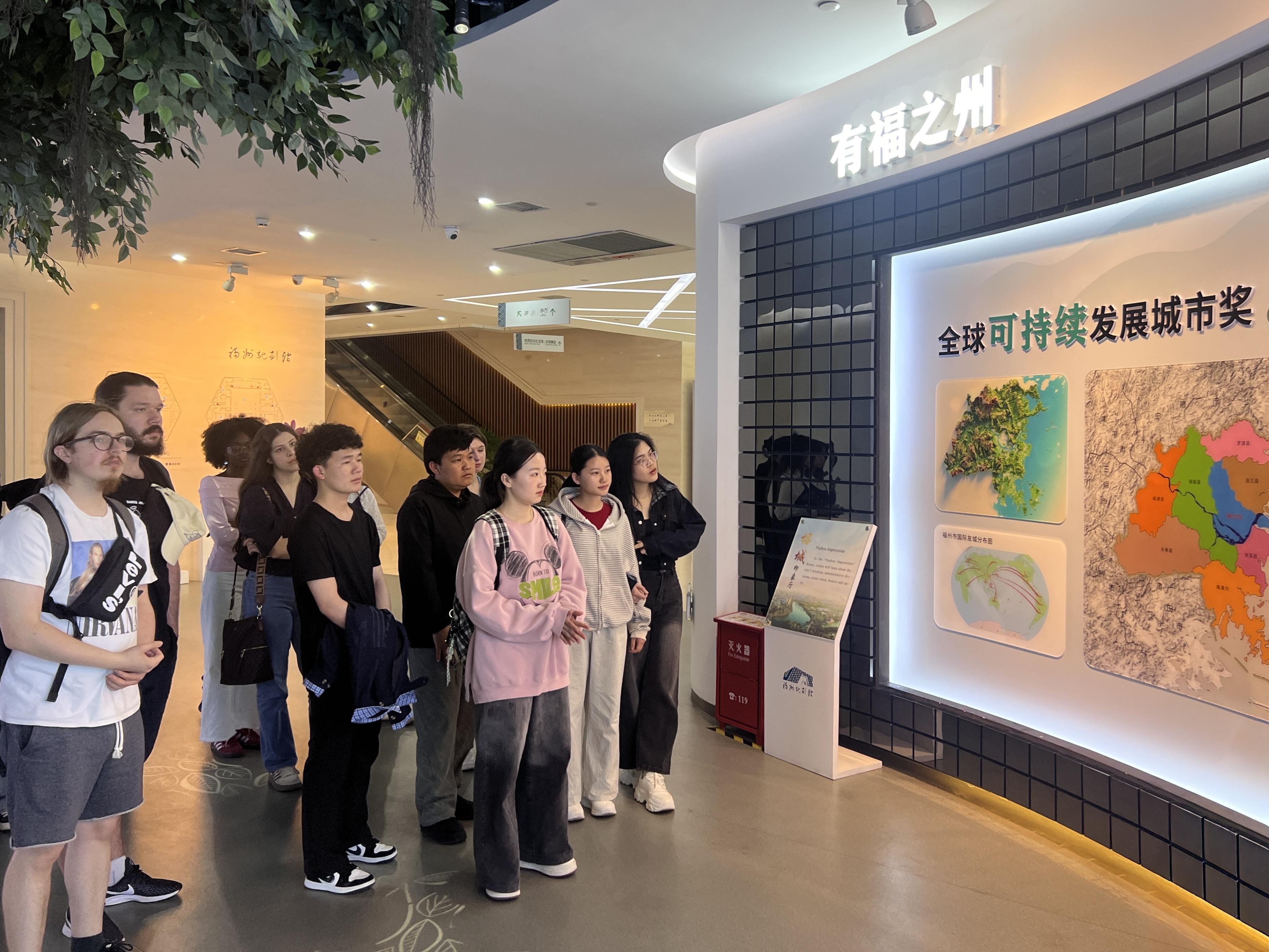 在福州城市规划展示馆,同学们在讲解员的带领下,沿着福州城市发展脉络依次走过昙石山文化、闽越古城、清代福州城、三坊七巷、镇海楼、廉江书院以及平潭自贸区、滨海新区、江阴港、闽侯大学城等标志性地点,观看了福州城市发展纪录片《有福之州,幸福之城》,聆听了传递中美人民民间友好情谊的“鼓岭故事”,对城市可持续发展理念有了更深入的了解。巴西留学生萧俊安表示,通过这次活动,他感受到福州是个美丽宜居的城市,不仅有悠久的历史,也是现代化国际都市,他回国后会向身边更多的人介绍福建与福州。