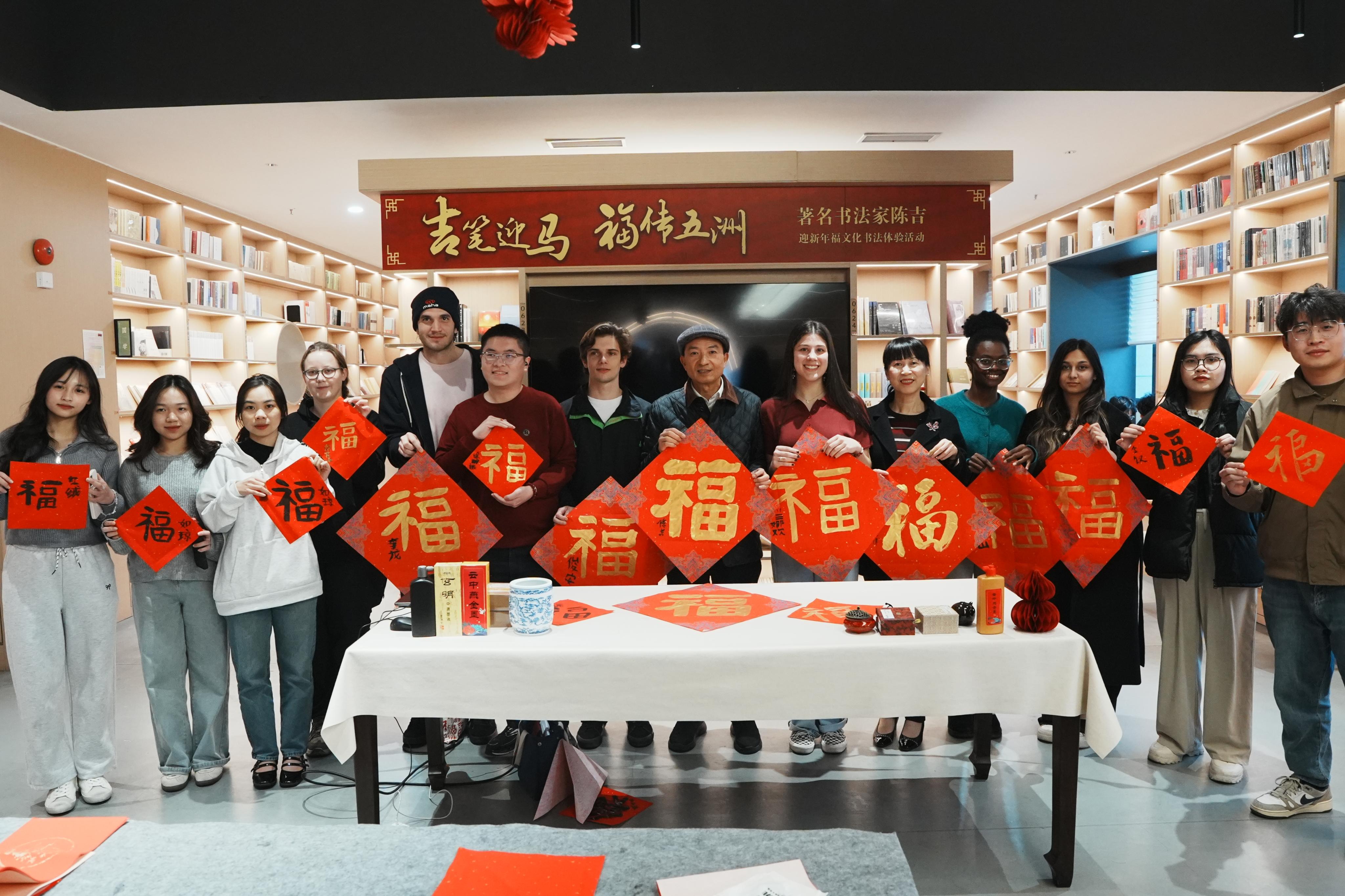 2026年元旦来临之际,我校各国留学生欢聚图书馆,参加“非遗大师劳作课”,共同书写“中国福”,沉浸式体验“福”文化。福建日报国际版给予报道。课堂上,中国非遗保护协会陈吉副会长以《谈福文化创造性转化、创新性发展》为题,从历史、美学与时代价值三个维度,解读了“福”字背后承载的民族情感与生活向往。他指出,“福”文化不仅是民俗的体现,更是中华民族共同的精神追求,而写“福”字正是这种追求的视觉表达。 活动...